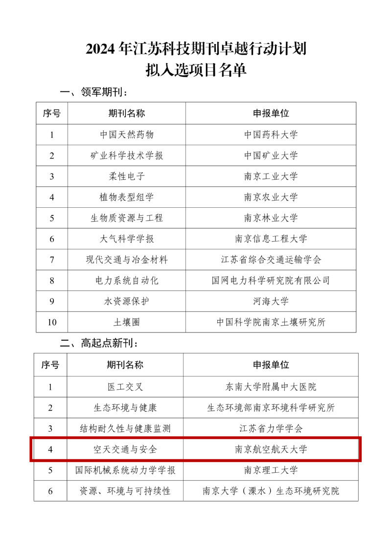 近日,我校牵头主办的英文国际期刊《空天交通与安全》(《Aerospace Traffic and Safety》,ISSN: 2950-3388,简称AETS)入选2024 年江苏科技期刊卓越行动计划高起点新刊项目。