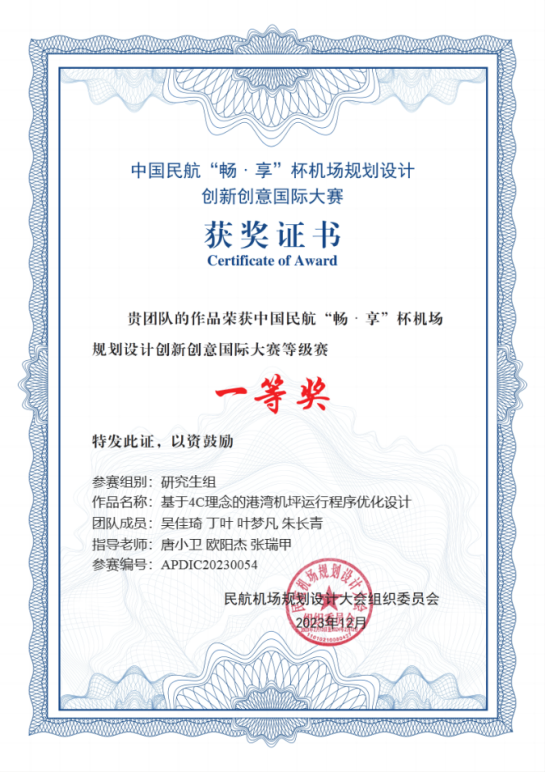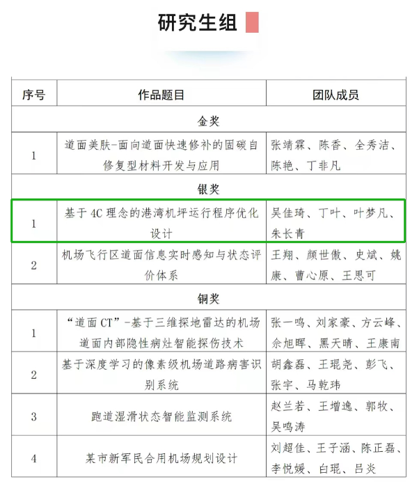 大赛自2023年3月正式启动以来,受到广泛关注和支持,收到了来自全国各高校、设计院、研究所及民航业内各单位等200支队伍的参赛作品。在历经了等级赛及初次评审后,团队作品“基于4C理念的港湾机坪运行程序优化设计”(指导教师:成人动漫 成人动漫 唐小卫、中国民航大学欧阳杰、上海浦东国际机场张瑞甲)在等级赛中荣获研究生组一等奖,与其他29支队伍一同入围精英赛,比赛过程中,学子们结合机场的实际需求和未来发展趋势开展规划设计,展示了扎实的理论知识和实践能力,最终荣膺精英赛研究生组银奖。