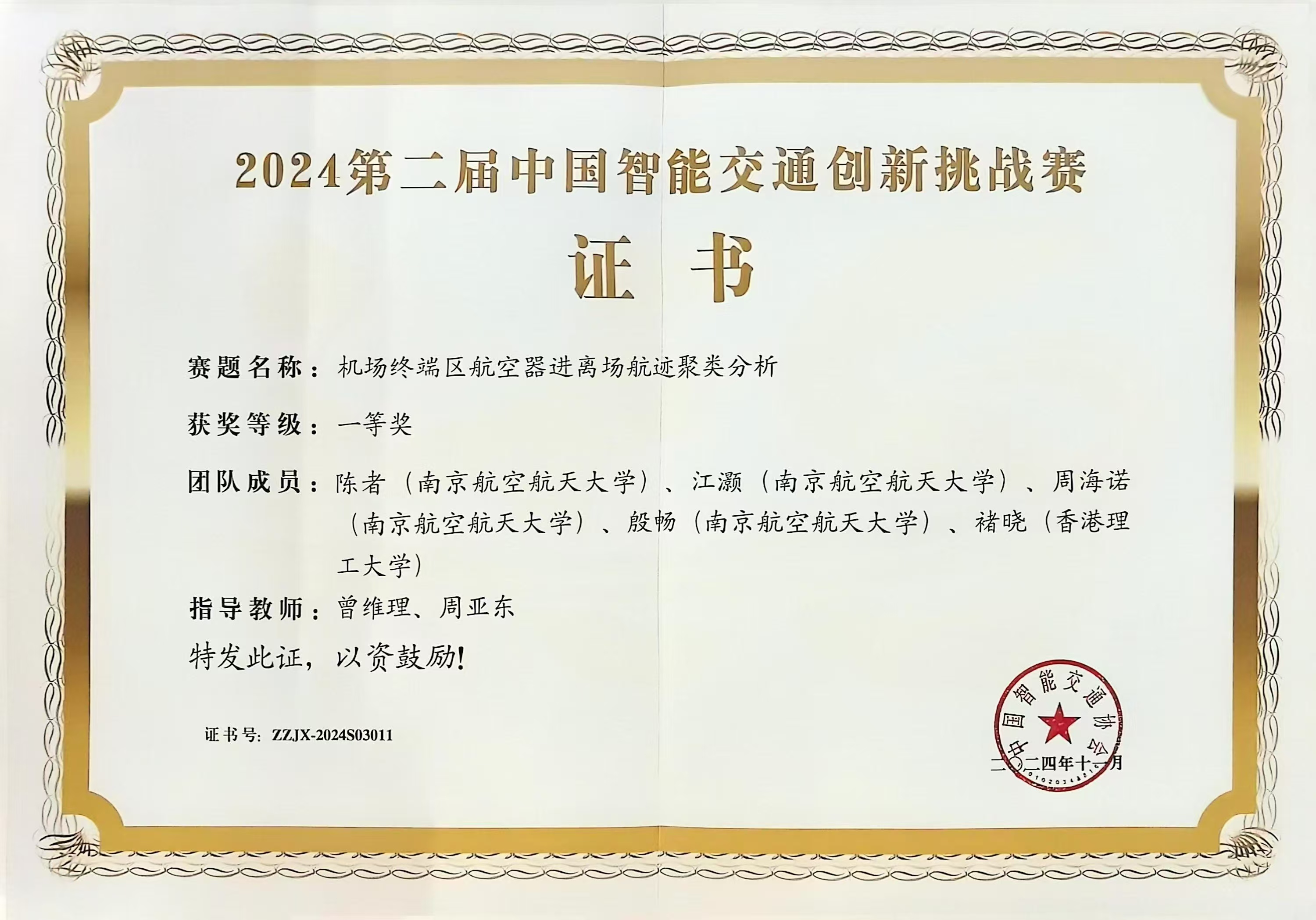 11月3日至6日,由中国智能交通协会主办的2024中国智能交通大会(ITSAC 2024)在杭州国际博览中心举行。成人动漫 曾维理、周亚东指导的学生团队获得空中交通赛题“一等奖”(排名第1)。